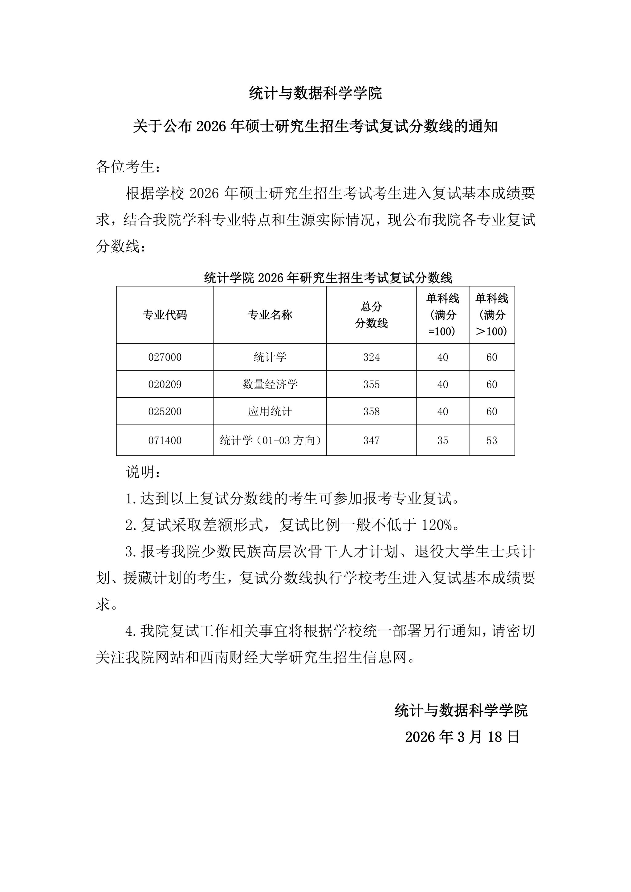 统计与数据科学学院关于公布2026年硕士研究生招生考试复试分数线的通知